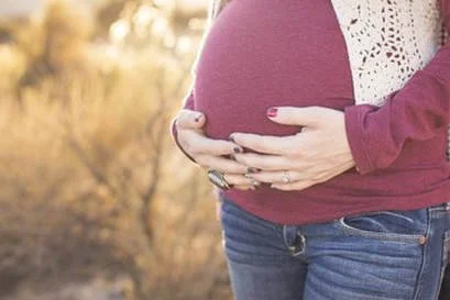 Close-up of a pregnant belly with two pairs of hands gently touching it in a softly lit outdoor setting.