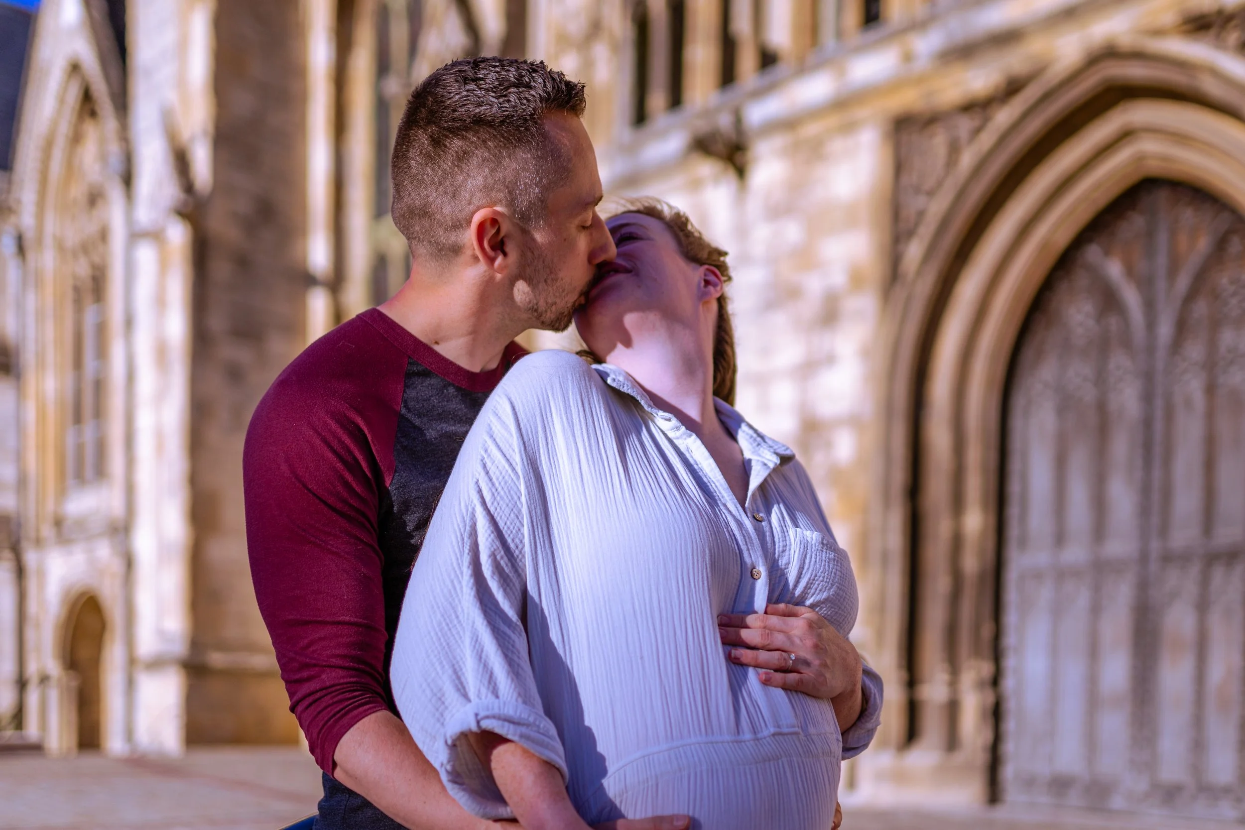 A couple kissing in front of a historic cathedral, with the woman holding her pregnant belly and the man embracing her. The background shows detailed architecture and a clear blue sky.