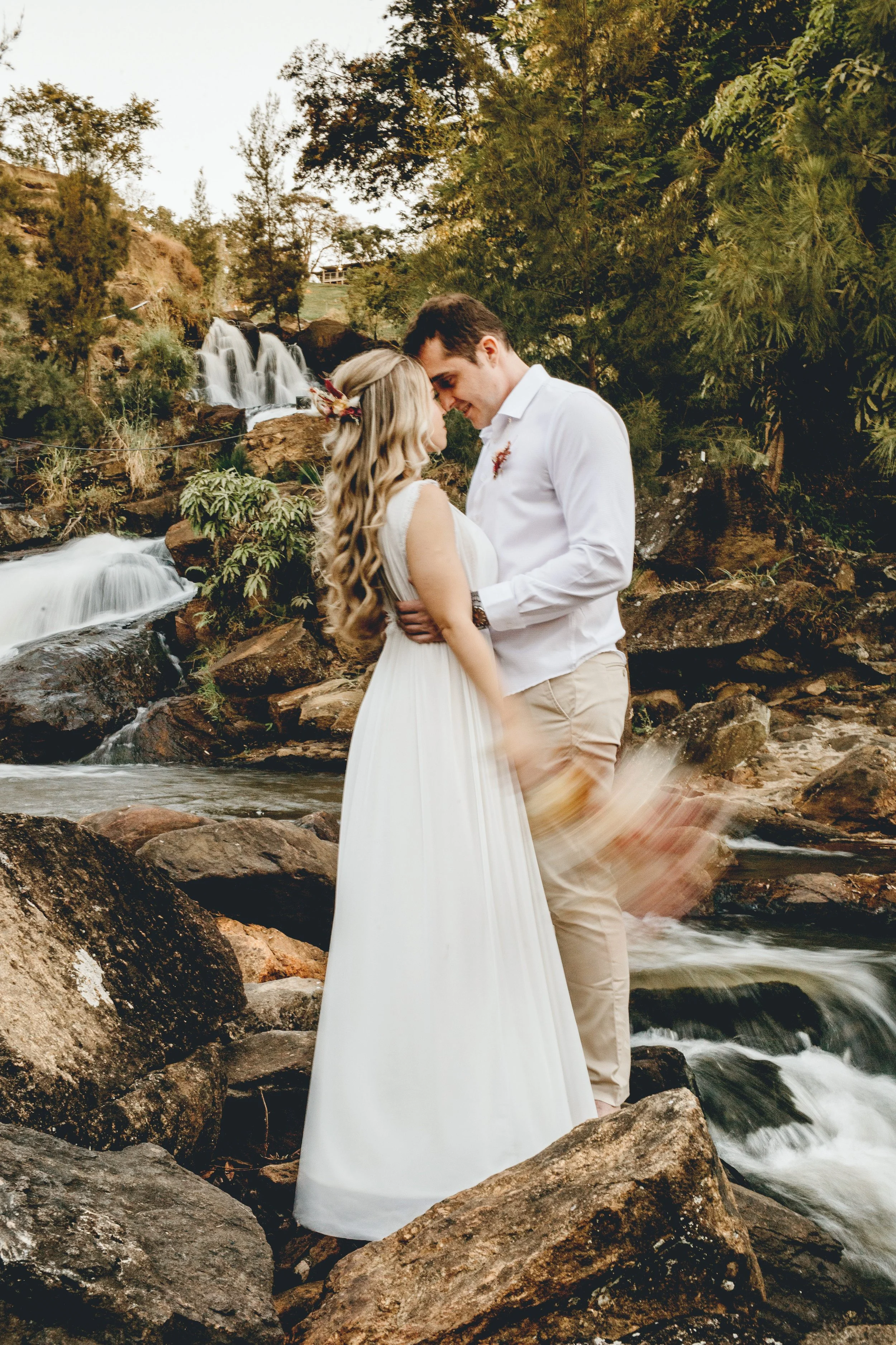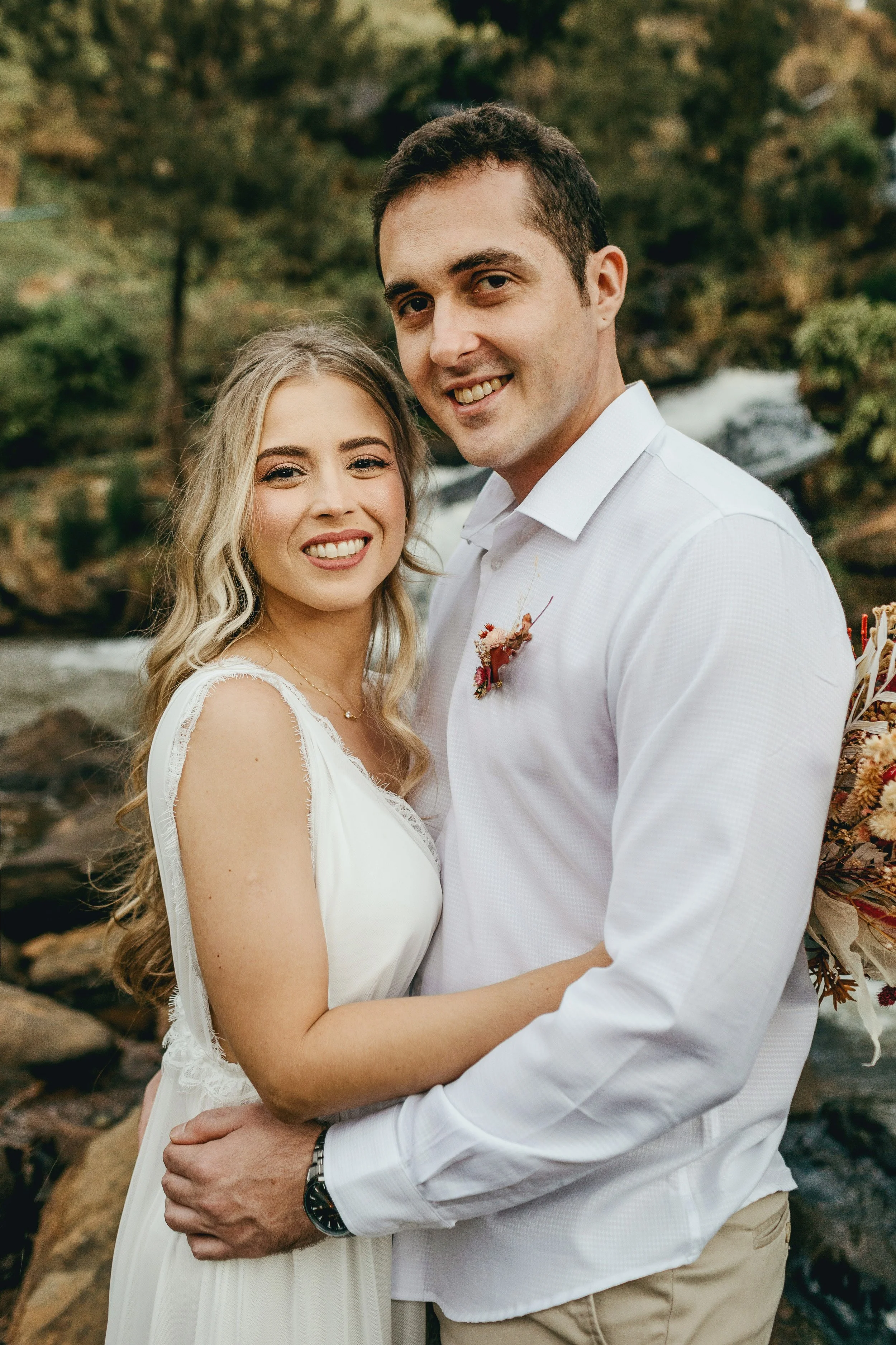 Bride and groom standing in front of a waterfall, embracing each other, surrounded by rocks and trees.