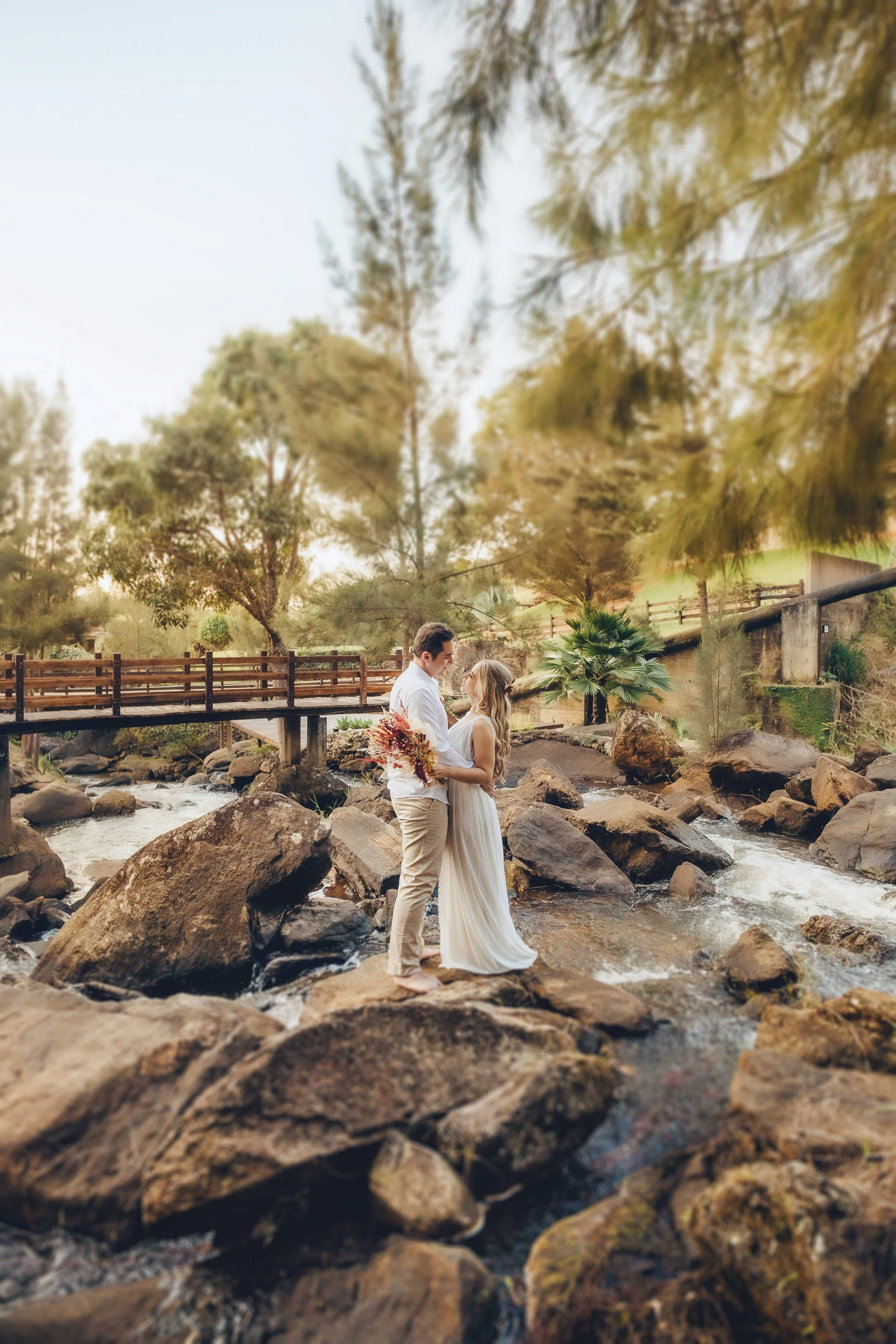 Couple embracing on rocky riverbank with trees and wooden bridge in background.